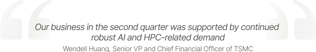 Taiwan Semi, the world’s largest chip manufacturer, posted strong Q2 earnings1, driven by high demand for AI chips. For the quarter, revenue increased 38.6% year on year to NT$933.8 billion (US$30.1 billion). As for net income, it came in at NT$398.3 billion, up 61% from the figure of NT$247.9 billion posted a year earlier.