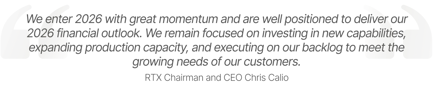 In terms of guidance, RTX said that it is targeting adjusted sales of $92.0 to $93.0 billion for 2026 versus $88.6 billion in 2025. Adjusted EPS is expected to be between $6.60 and $6.80 versus $6.29 for 2025.