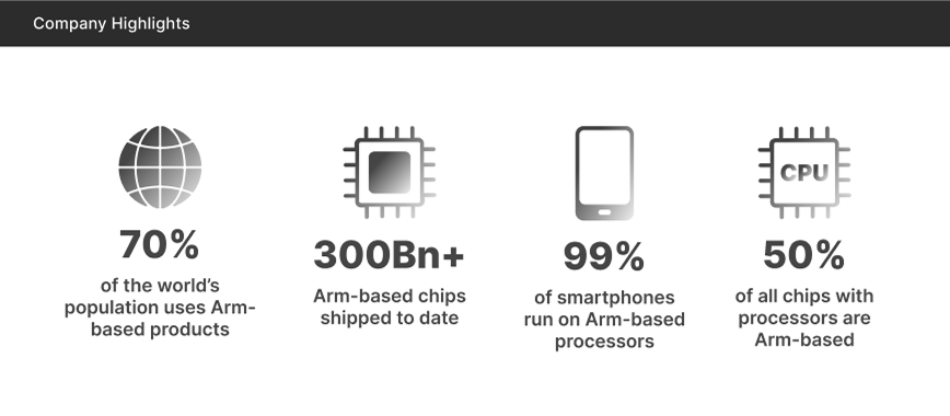 Arm is a British semiconductor company that is based in Cambridge, England. Founded in 1990, it has become a dominant force in the technology industry in recent decades, particularly in the mobile computing space. To date, more than 300 billion chips1 built with Arm technology have been shipped globally. And today, around 70%1 of the global population uses its technology.