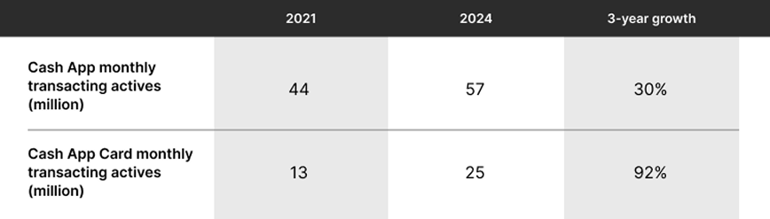 At the end of 2024, Cash App had 57 million monthly transacting actives, 30% higher than the figure three years earlier1. Meanwhile, Cash App Card had 25 million monthly actives, 92% higher than the figure three years earlier. This level of growth suggests that the product is resonating with Americans. According to the company, the Cash App Card has strongly resonated with younger customers – it estimates that 21% of all 18-to-21-year-olds in the US used Cash App Card in 2024.