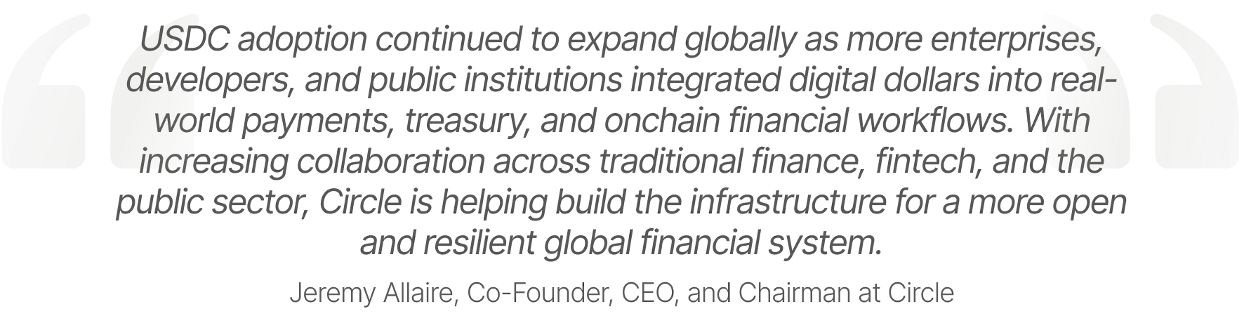Helped by favorable regulation such as the GENIUS Act, USDC (Circle’s primary stablecoin) onchain transaction volume grew 247% to $11.9 trillion. At the end of the quarter, USDC in circulation was $75.3 billion, up 72% year over year.