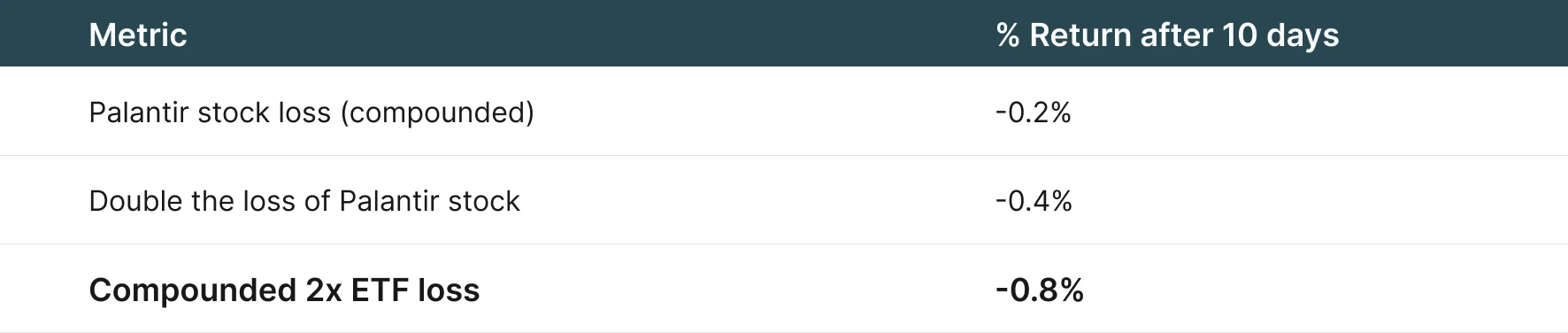 Stock prices don’t usually move up or down in a straight line – and that’s when compounding can have a negative impact. Now suppose Palantir oscillated between a 2% gain and a 2% loss each day. Here are the results using the Leverage Shares 2X Long Palantir Daily ETF (PLTG):