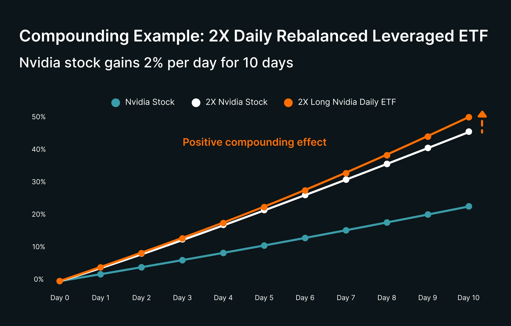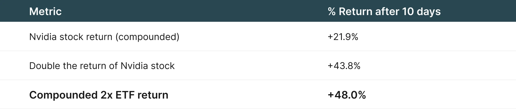 With a steady uptrend, the "compounding effect” of leveraged ETFs can work in your favor. Notice in the chart below how the compounded 2X ETF return was more than double the return of Nvidia stock.