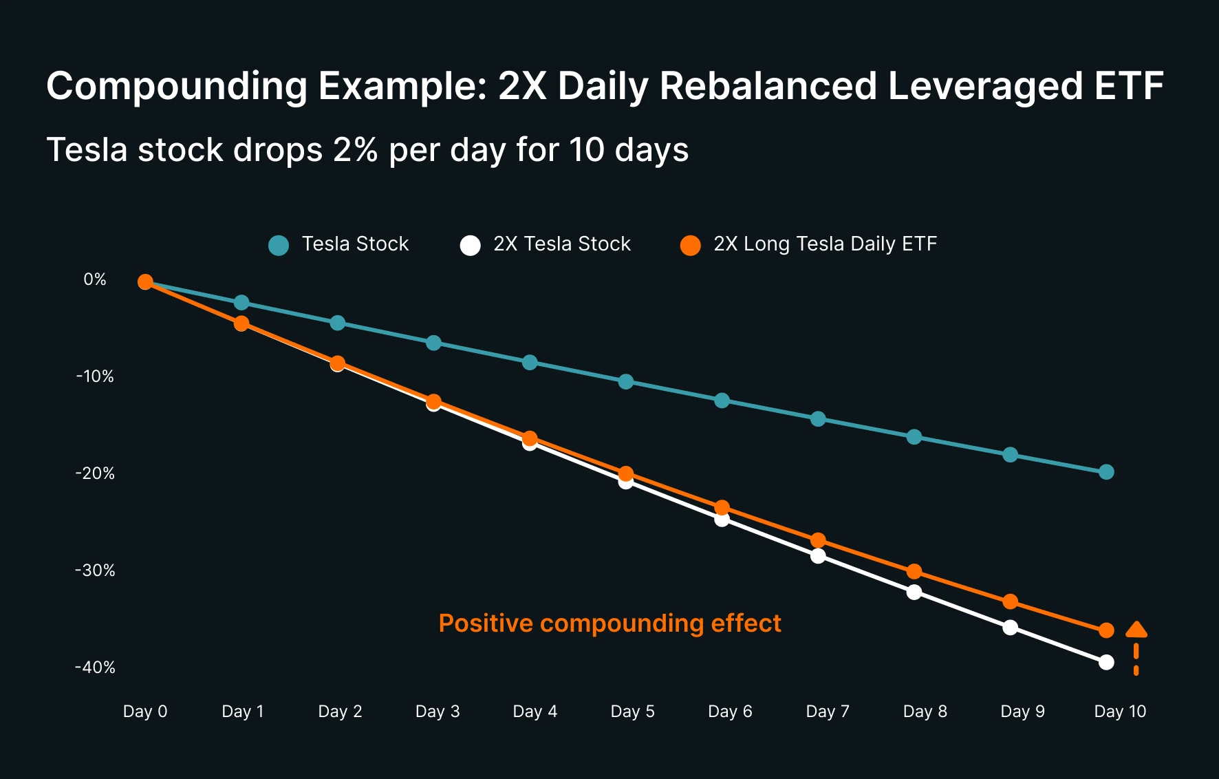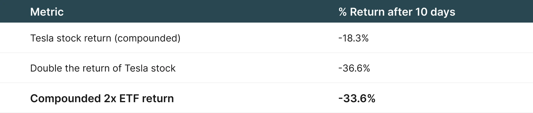 Tesla stock lost 18.3% after 10 days, which is less than the expected 20% loss from a 2% daily drop. That’s because each 2% drop applies to a smaller base each day. For the leveraged ETF, the compounding effect worked in your favor again: you lost slightly less than twice the loss on the stock.