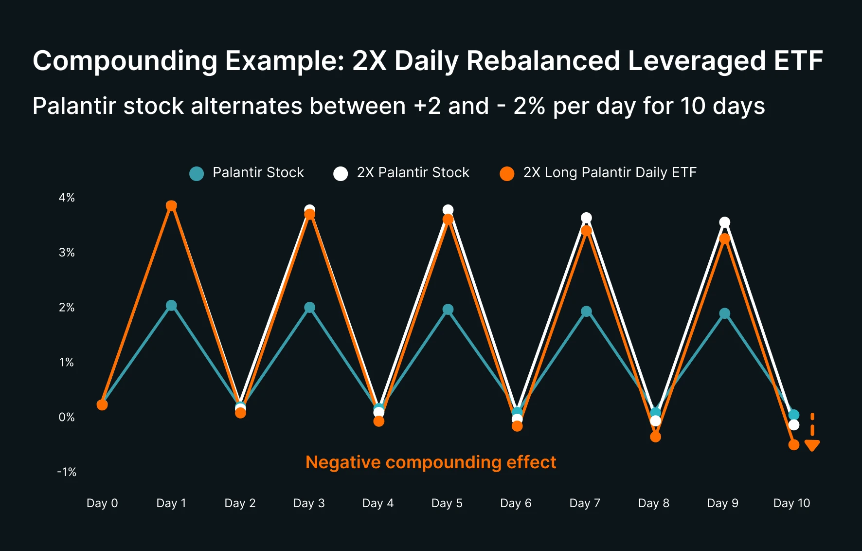 In sideways or choppy markets, compounding and volatility drag erode returns – even if the stock doesn’t move much overall.