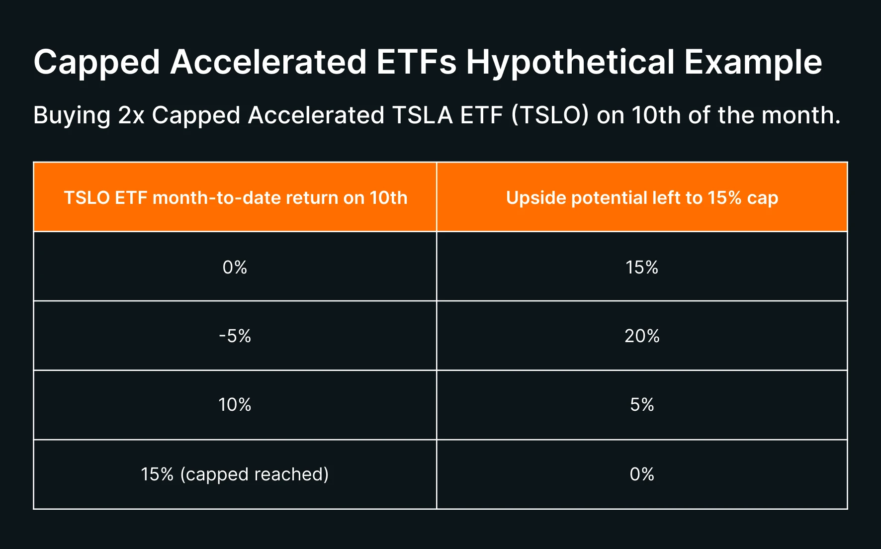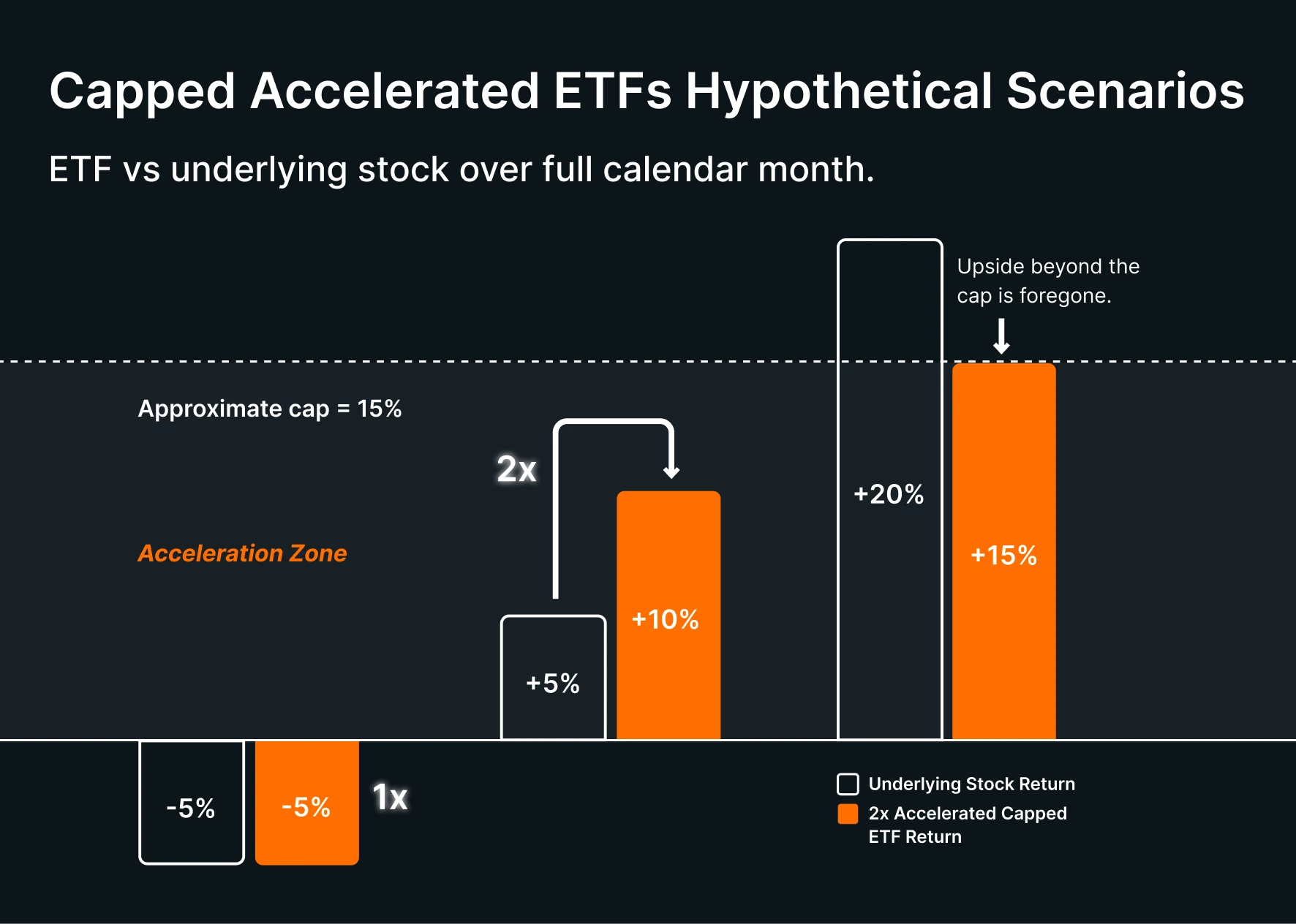 Capped Accelerated ETFs aim for about twice the monthly upside of a stock, up to a fixed cap. They also aim for with one times the downside if the stock falls during the month.