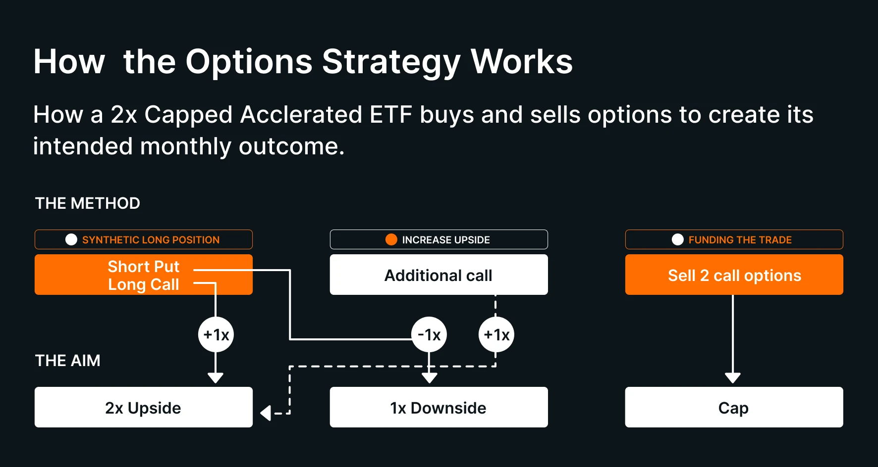 Step 2 – Add extra upside: The ETF then buys another call option. This creates the acceleration zone, where the ETF can deliver about twice the stock’s gains until it reaches the cap.