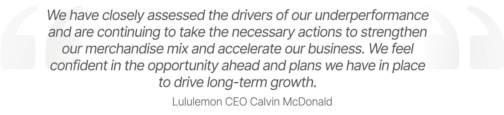 Overall, the turnaround plan is an effort to reassert Lululemon's identity as a premium brand with cutting-edge designs and technical performance that competitors cannot easily replicate and improve sales growth and profitability levels.
