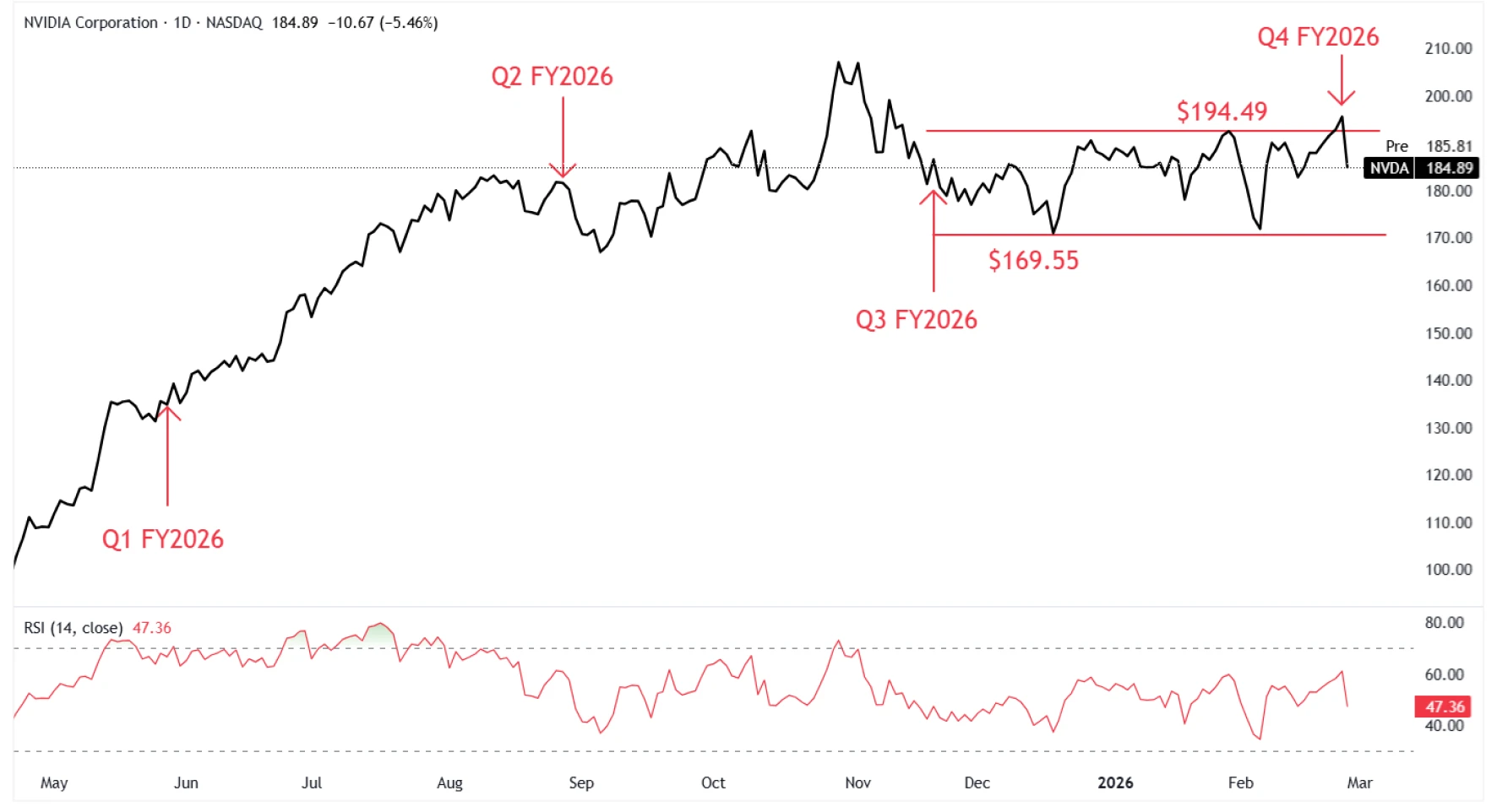 Source: TradingView. Nvidia daily price chart, as of February 26, 2026