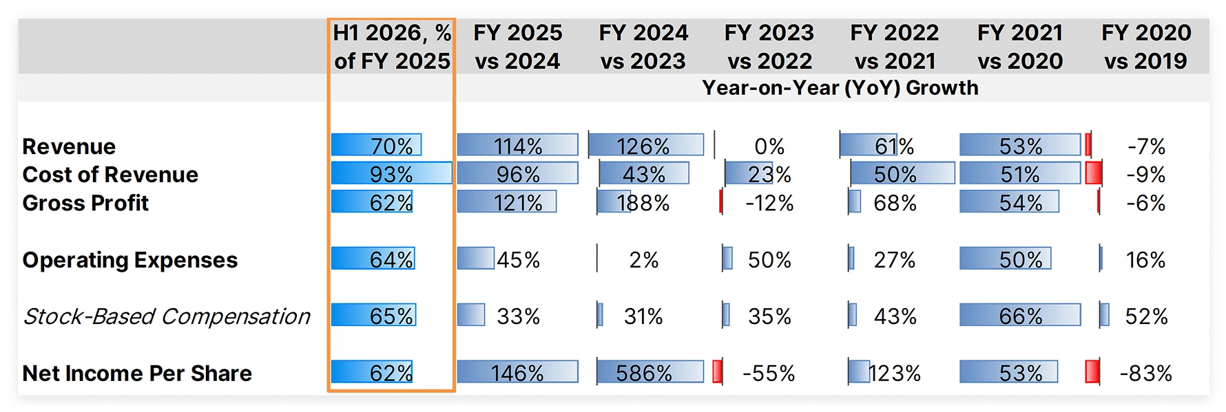 If trends continue, revenue for FY 2026 will be 40% higher than that in FY 2025 and net income will be 24% higher. This, however, is a significant stepdown from the triple-digit percentage growth seen over the last two FYs that led to the stock’s sky-high valuation. In the current FY, however, the stock has been very volatile, leading to the lowest potential growth in stock-based compensation expense in over six years.