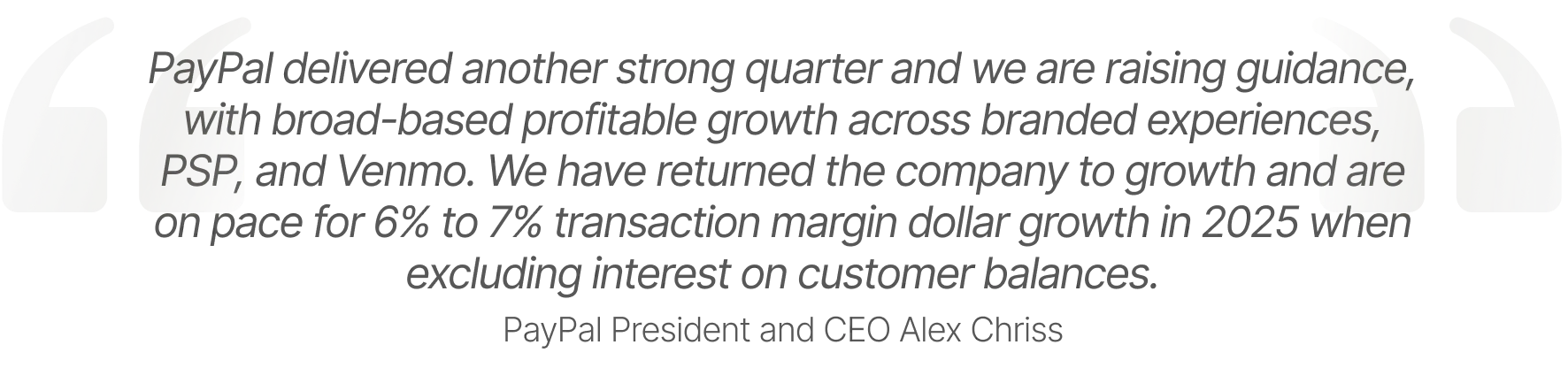 PayPal posted its earnings for the third quarter2 of 2025 on October 28 and they were generally solid. For the quarter, revenue amounted to $8.4 billion, up 7% year on year and ahead of the consensus estimate of $8.2 billion3. Meanwhile, adjusted earnings per share (EPS) was $1.34, up 12%, and above analysts’ forecast of $1.21. Total payment volume (TPV) for the period was $458.1 billion, up 8% year on year.