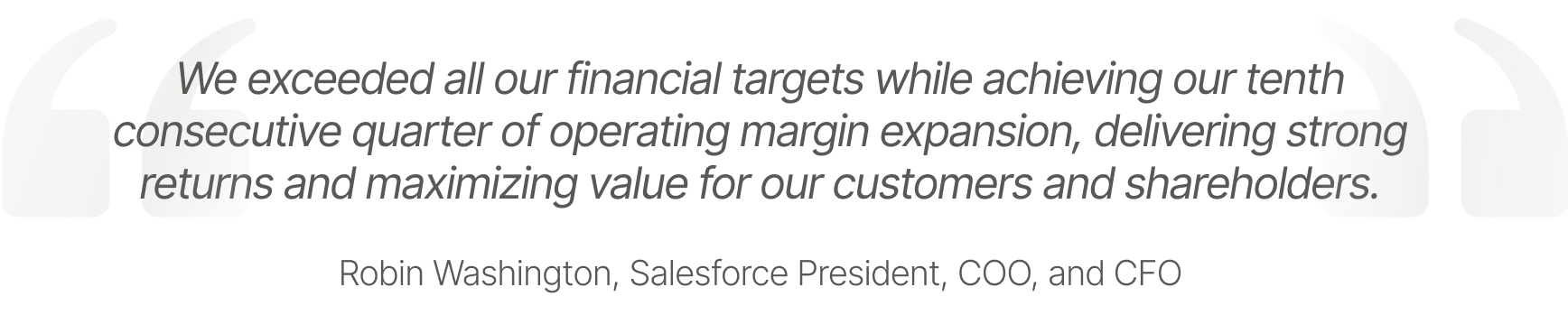 For the quarter ended July 31, Salesforce posted revenue of $10.24 billion, up 10% year on year (9% in constant currency). This was ahead of the consensus estimate of $10.14 billion.