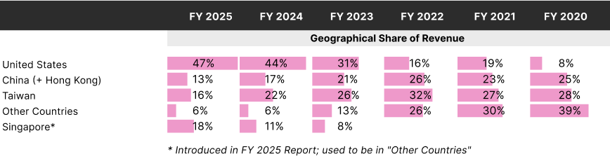 The final concern is less to do with technical issues and more to do with geopolitics. In its reporting of geographic regions driving revenue, a new entry was quietly introduced in the FY 2025 report: Singapore.