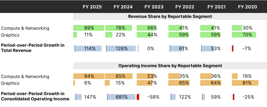 Two years ago, i.e. around FY 2023, was when the company’s client mix shifted from the individual – be they gamer, crypto miner or PC user – to the corporate data center. The latter tends to be a recurrent deep-pocketed buyer with highly specific requirements while the former delivered it substantial renown among the larger public. Switching over to the “corporate” certainly did it a world of good, as evidenced by the massive burst in revenue and shifting trends in operating income.