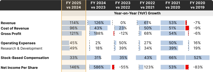 It’s very unlikely that the company will see the massive 586% growth in Net Income Per Share it posted in FY 2024 for some time but the recently concluded FY’s trend in growth (after restating to nullify the 10:1 stock split made earlier in FY 2025) is quite similar to that in FY 2022 when the company’s client mix started to shift towards the corporate segment via data centers. The company’s success in corporate outreach is writ large even in FY 2025’s press release accompanying1 the earnings: it announced becoming a key technology partner for the $500 billion Stargate Project brought to bear by the Trump administration, the likes of Cisco and Amazon Web Services (AWS) continue to integrate their industry-leading products into their offerings. The company also released an interesting statistic: more than 75% of the systems on the Top 500 list of the world’s most powerful supercomputers are powered by the company’s products.